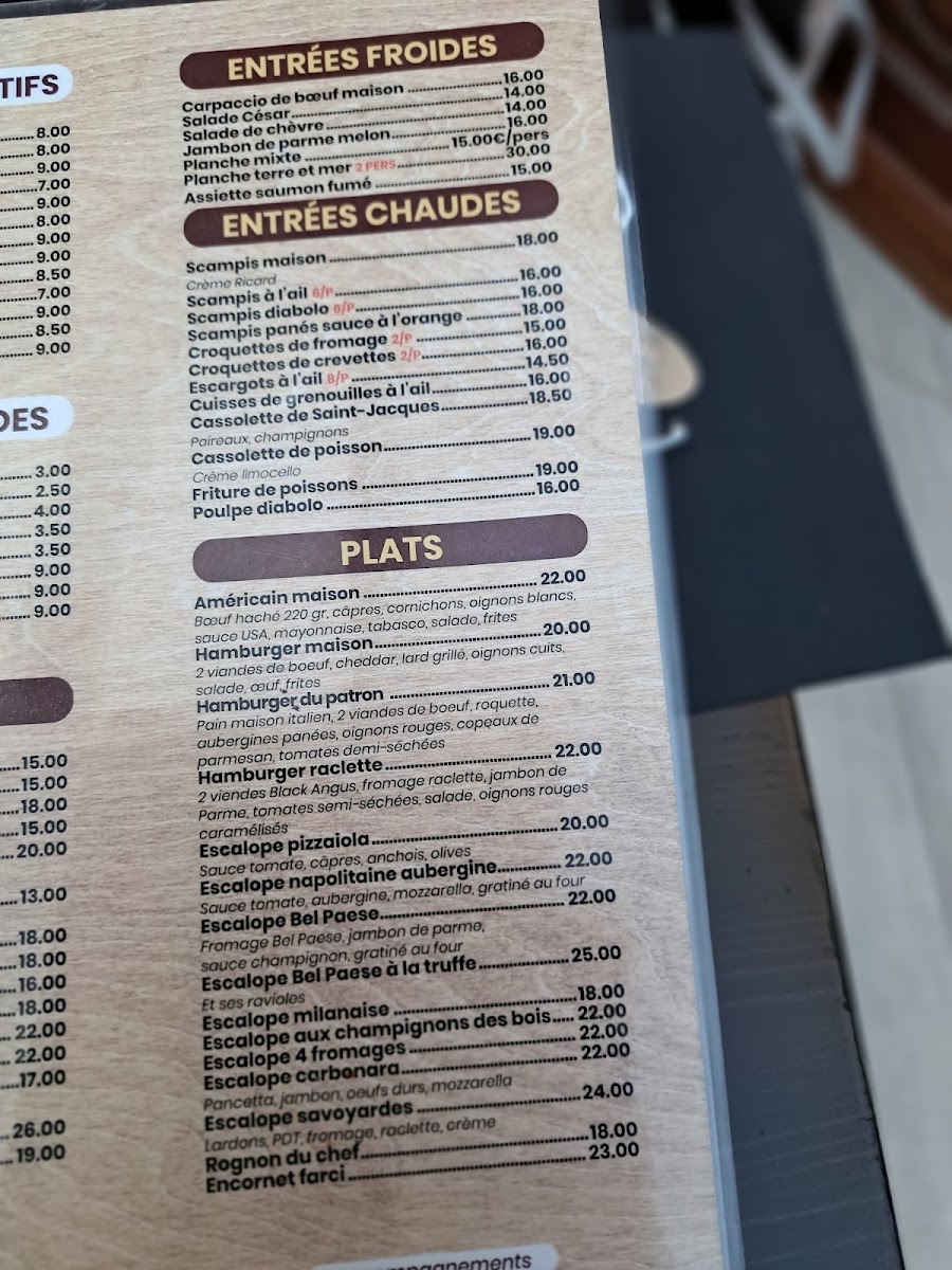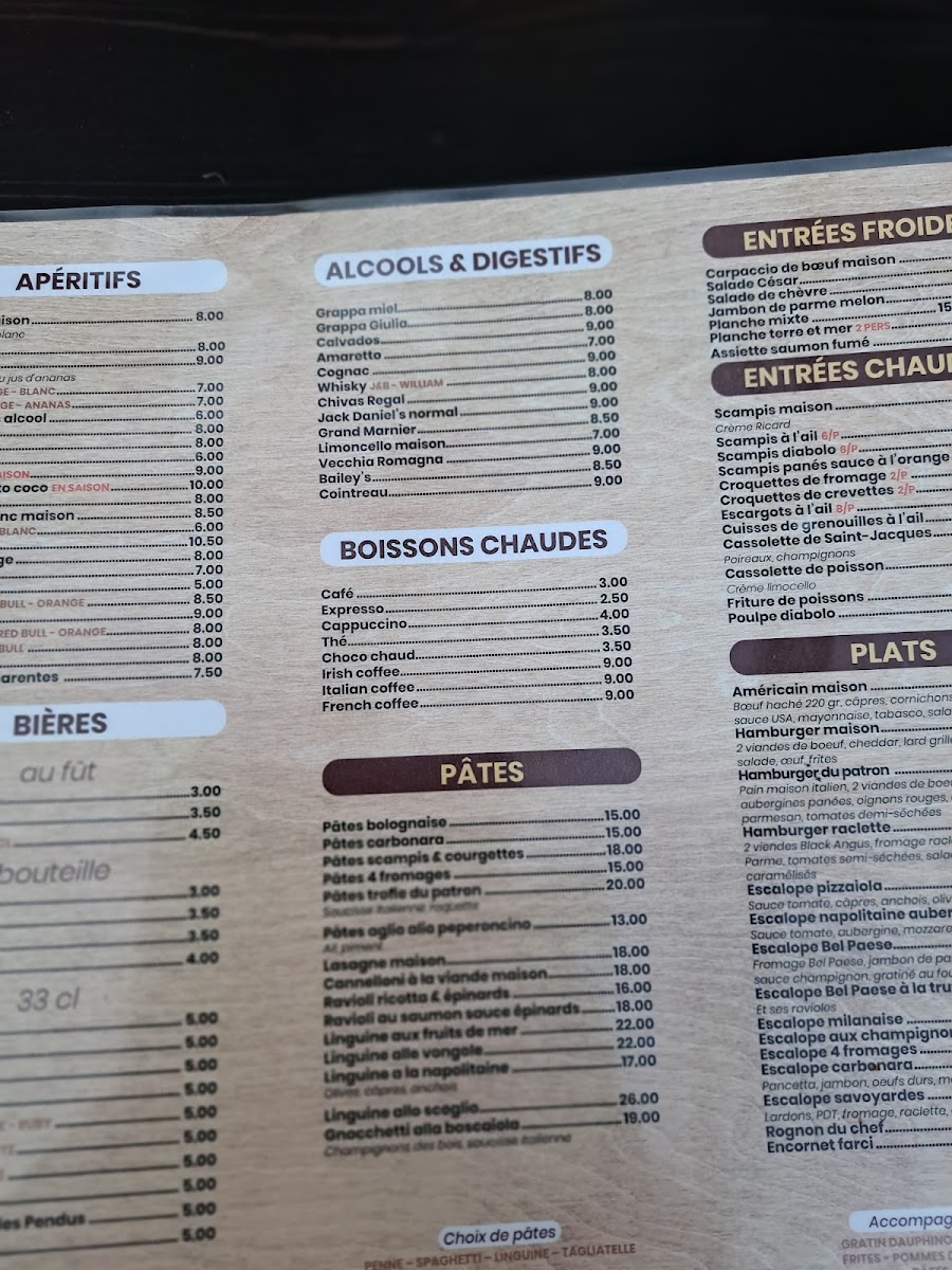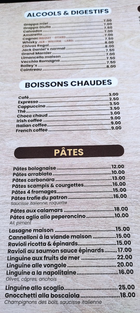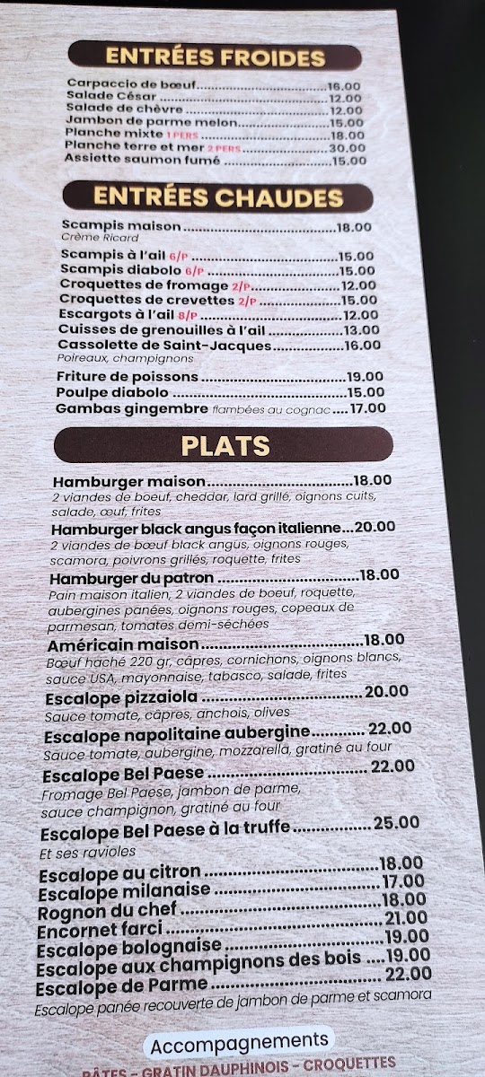Overall, Napul'é - Grillades Au Feu De Bois delivers a satisfying and well-rounded menu that highlights the richness of wood-fired grilling with a touch of indulgence. Signature offerings like the Côte À L Os Sauce Aux 3 Poivres showcase expertly cooked meat paired with bold, peppery flavors, while the Brochettes Au 4 Viande Boeuf Canard Dinde Porc provide a generous and diverse tasting experience for those who enjoy variety. Seafood lovers are equally catered to with the impressive Brochette de Scampis Géante, and lighter starters such as the Carpaccio de Bœuf add a refined balance to the meal. Classic favorites like the Brochette de Boeuf remain reliable staples, and the drink selection, including the refreshing Picon Vin Blanc and the comforting Irish Coffee, rounds out the experience nicely. Altogether, the menu reflects a thoughtful blend of hearty grill specialties and complementary dishes, making it a strong choice for those seeking both quality and flavor in a relaxed setting.